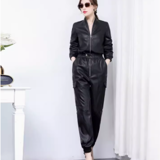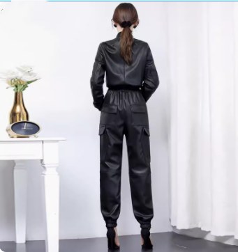 Unique And High-end Feeling, Slim Fitting Black PU Leather Work Suit And Jumpsuit For Women